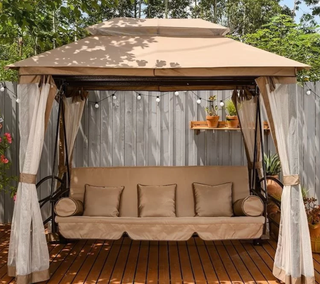 - Садовые качели с крышей из поликарбоната. Хит продаж! Отлично подойдут для компаний из трех человек. Максимальная нагрузка — 250 кг.