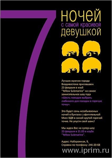 «Шоу 6 поводов выбрать любимого человека» получить в подарок на 23 февраля от клуба «Yellow Submarine» поездку в страну любви Тайланд! Приобрети купон, получи 50% скидку на участие в шоу и выиграй увлекательное путешествие в страну Тайланд с самой красивой девушкой города Владивостока.