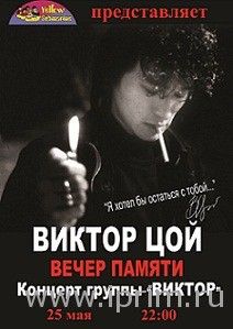 25 мая, 22.00. Самая популярная рок-группа из Санкт-Петербурга – „ВИКТОР“, как и положено поклонникам Виктора Цоя, поют как свои, так и песни Цоя, причем схожесть с оригиналом фантастическая…