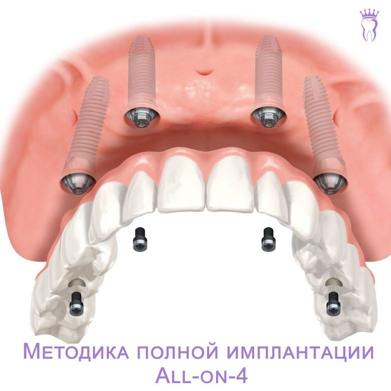 Суть имплантации All-on-4 заключается в установке в костную ткань челюсти четырех имплантатов, на которые в последствии ставится условно-съемная протезная конструкция.
