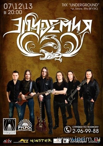 Впервые во Владивостоке!!! Концерт группы ЭПИДЕМИЯ 7 декабря в ТКК UNDERGROUND!!!Главная российская heavy power metal группа приготовила специально для дальневосточных поклонников необычную программу - Total Best Of, сплошь состоящую из «нетленок»!!! Не пропусти долгожданный концерт!!!