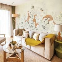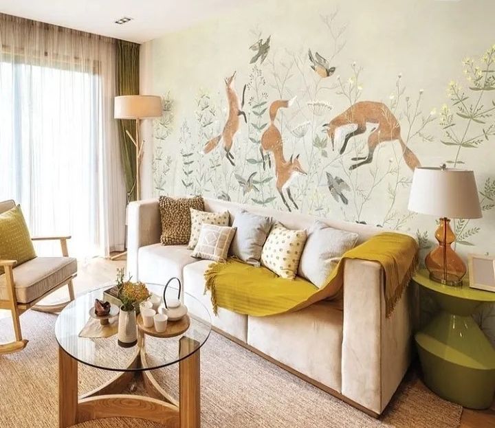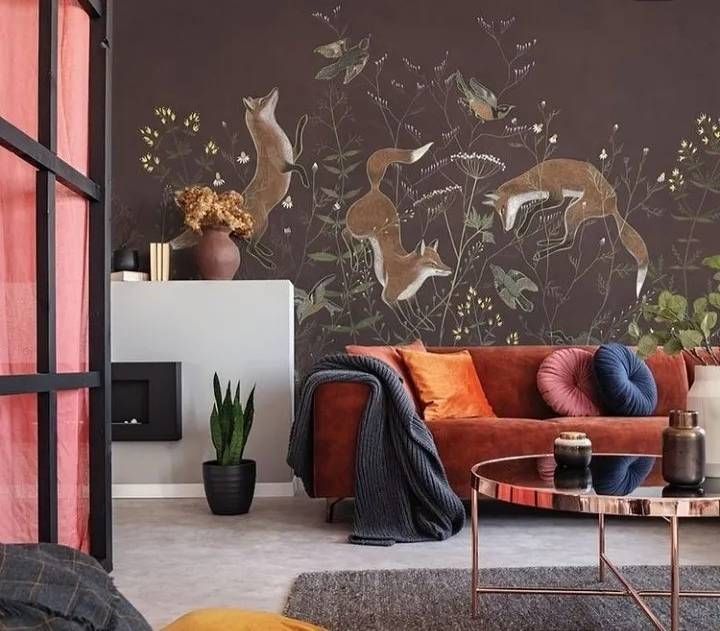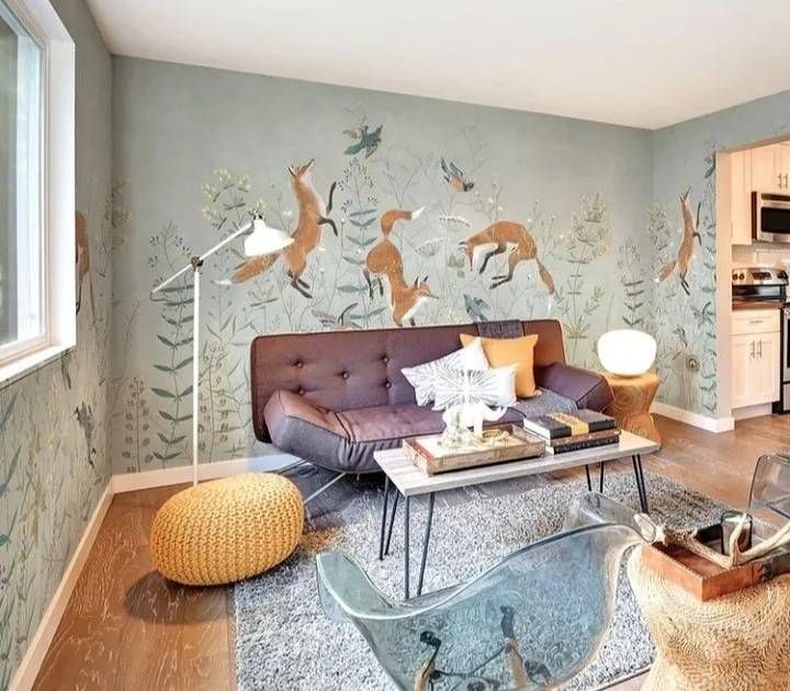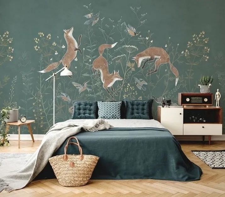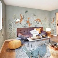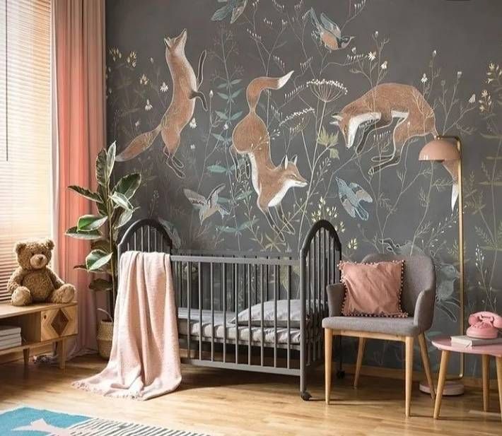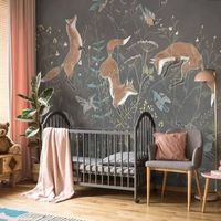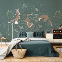 Обои изготавливаются по размеру заказчика. Можно украсить резвящимися лисичками только одну стену, а остальные оформить фоновыми обоями в тон. Хотите, чтобы лисичек было больше? Изготовим полотна для каждой из стен.