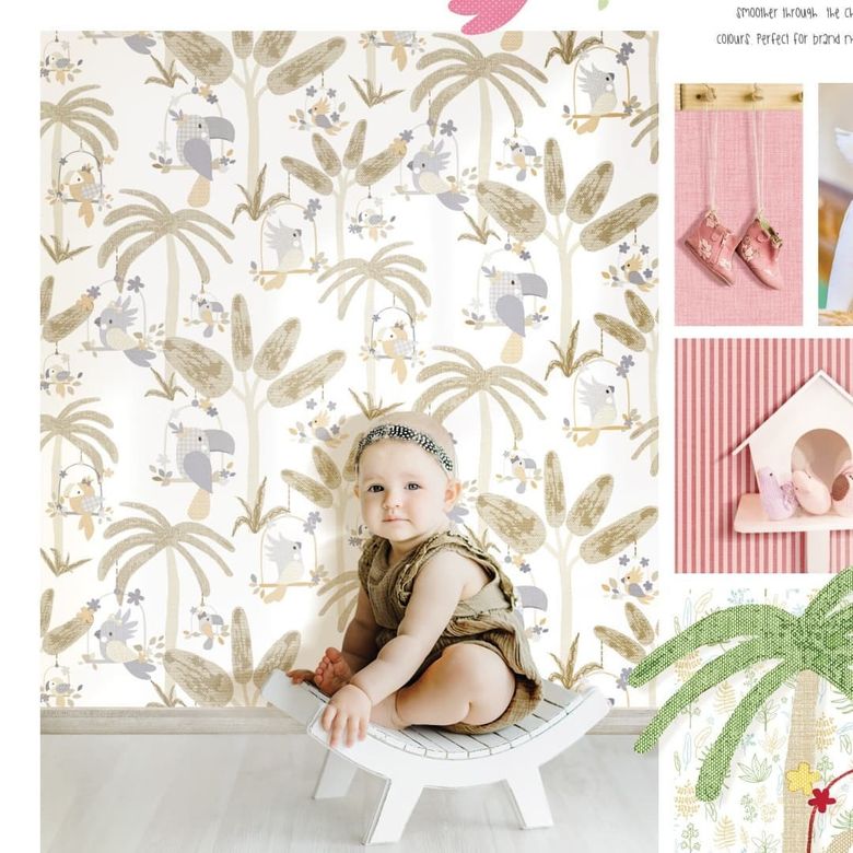 Уровень мимимишности у данной коллекции зашкаливает! Акварельные деревья и милые тропические птички, словно вырезанные из цветной бумаги, на пастельных бежевых полотнах с интересной фактурой - настоящая находка для детской комнаты. Цветовое разнообразие позволит без труда подобрать обои как для комнаты мальчика, так и для комнаты девочки.