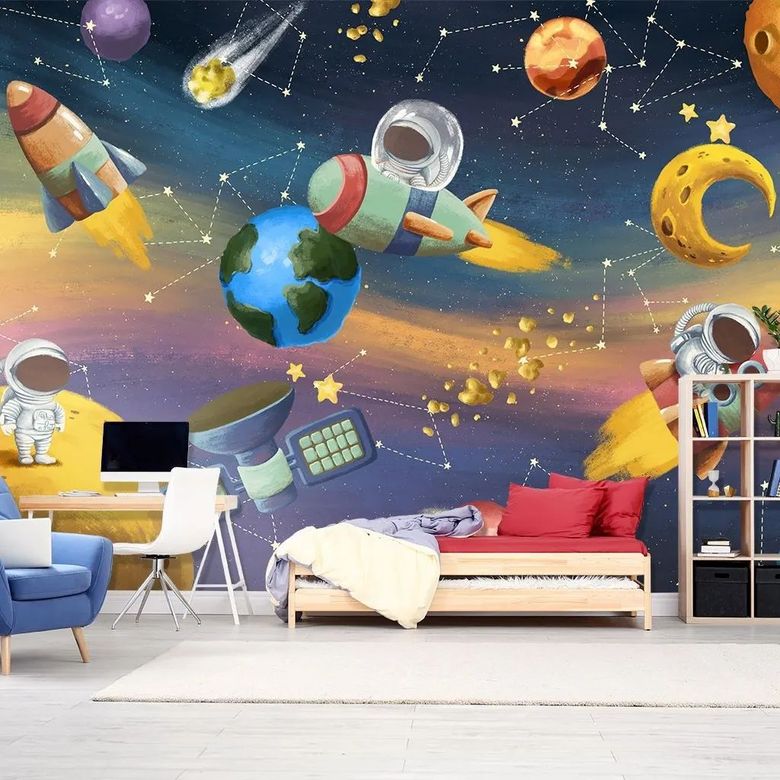 Планируете сделать детскую комнату в космическом стиле? Интерьер-салон "Арт-Деко" поможет подобрать подходящие обои для оформления стен. Мы также занимаемся изготовлением фотоштор и фототюля, картины, ковров различных размеров, декоративных подушек и подушек-валиков, пледов, печатая любые изображения, найденные заказчиком самостоятельно или выбранные из нашего каталога.