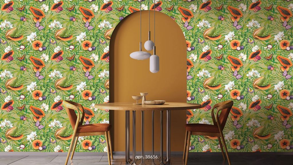 Интерьер-салон "Арт-Деко" рад представить вам сочное обновление дизайнерской коллекции Enjoy! Теперь она наполнена новыми сюжетами с яркими, аппетитными изображениями! Узор со спелой папайей, словно тропическое солнце, согреет вас своим теплом и привнесет экзотическую нотку в интерьер кухни или столовой. Сочетать такой сюжет можно с мебелью из натурального дерева и текстилем теплых, земляных оттенков.