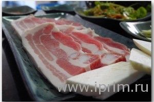 Например, самгепсаль, популярное корейское блюдо, представляет собой толстые нарезки трехслойной свинины. "Сам" значит три, "геп" - слой, "саль" - мясо. Самгепсаль подают с закусками (панчан), острым салатом из зеленого лука, отдельно подается чеснок, листья салата. Мясо готовят самым простым образом: кладется на жаровню, как только мясо обжаривается с одной стороны достаточным образом (внизу появляется характерный «загар»), переворачивается на другую сторону, при появлении загара на этой стороне, мясо можно разрезать ножницами на небольшие кусочки готовые к употреблению...