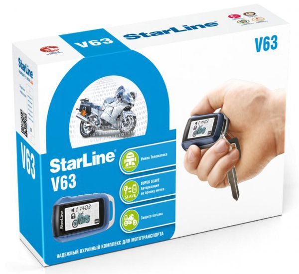 Охранный комплекс StarLine MOTO V63 предназначен для защиты мототранспорта от угона. Управляется с помощью брелока с ЖК-дисплеем. На брелок приходят сервисные и тревожные сообщения от встроенного в процессорный блок датчика удара и наклона, а также геркона, который защищает багажное отделение от взлома.