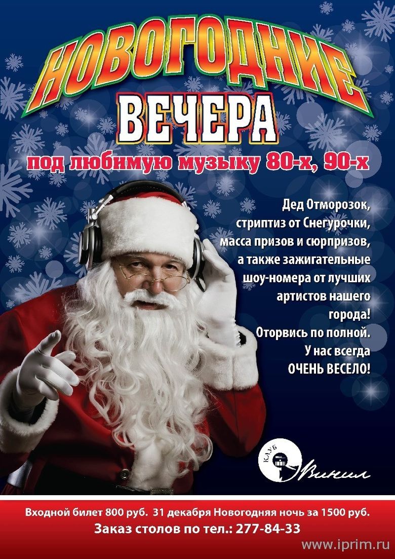С 20 декабря в клубе "Винил" проводятся новогодние вечера под любимую музыку 80-х, 90-х. Вас ждут Дед Отморозок, стриптиз от Снегурочки, масса призов и сюрпризов, а также зажигательные шоу-номера от лучших артистов нашего города!