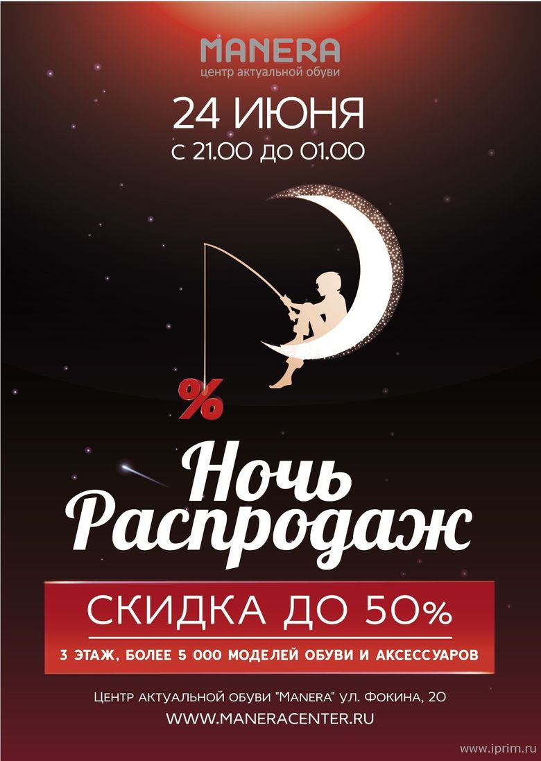 Только сегодня, 24 июня, с 21.00 до 01.00, центр актуальной обуви "MANERA" приглашает на "Ночь Распродаж".