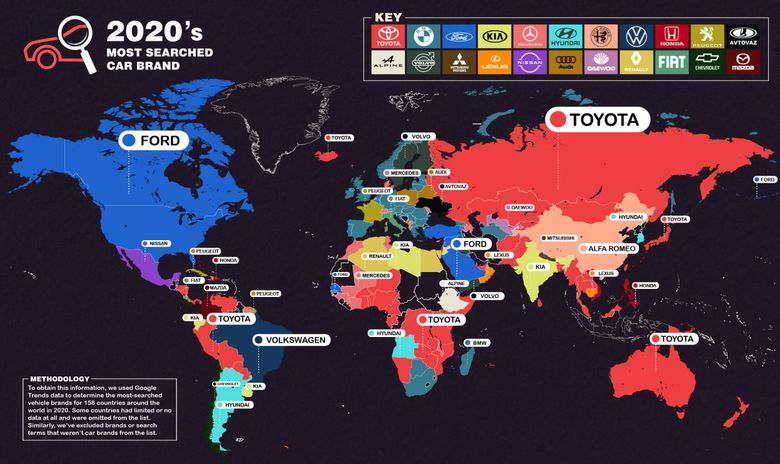 За 2020 год самым искомым брендом автомобилей оказался бренд Toyota, обогнав BMW и Mercedes-Benz.