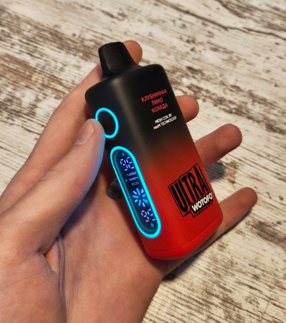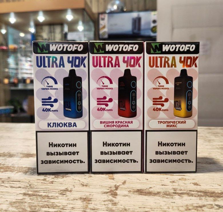 Одноразовые устройства Ultra 40K от WOTOFO. Ёмкость аккумулятора составляет 1 000 мАч с возможностью зарядки через разъём USB Type-C.