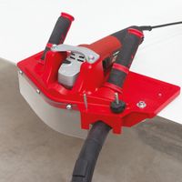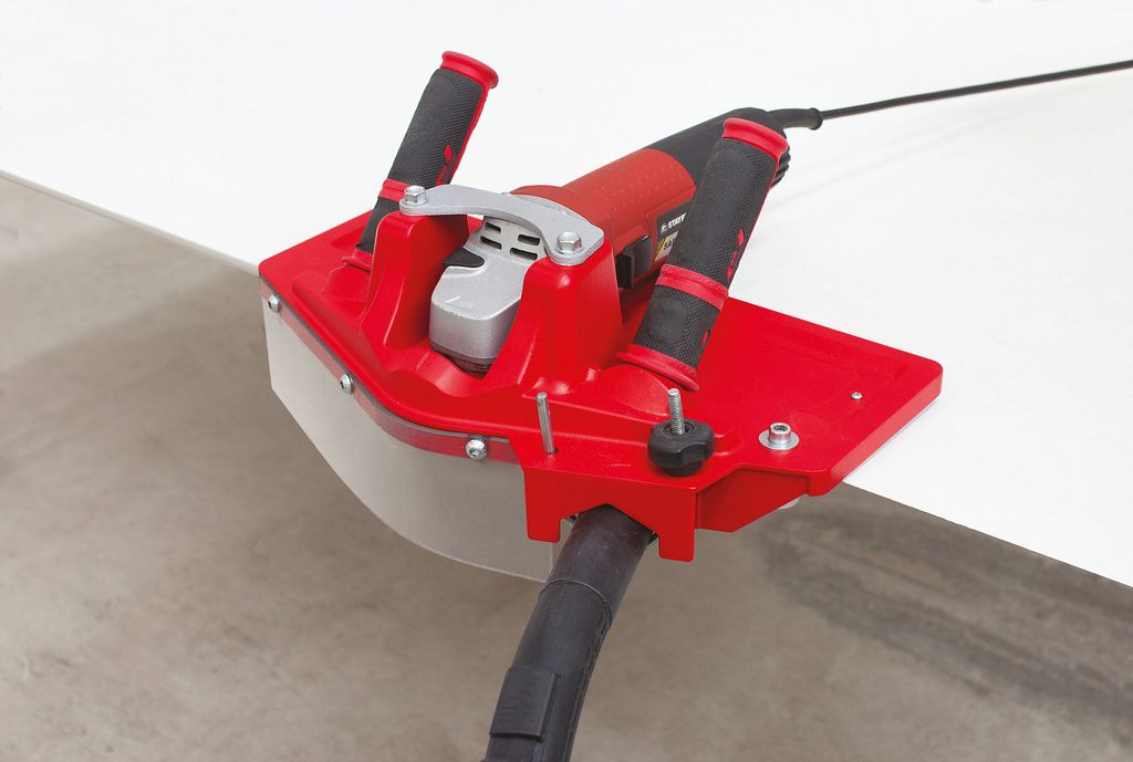 Процесс эксплуатации станка прост - плита устанавливается на рабочую поверхность стола таким образом, чтобы край, подлежащий торцовке, был вынесен на достаточное для установки устройства расстояние. Перед установкой устройства поверхность плиты должна быть полностью очищена от любых загрязнений. К устройству подключается строительный пылесос. Далее устройство устанавливается на край плиты со стороны противоположной направлению движения вала со шлифовальным диском (обозначено стрелкой на устройстве) и плотно прижимается. После включения шлифовальный диск прижимается к краю торцевой поверхности плиты и по мере шлифовки материала, устройство равномерно перемещается по линии торца от начальной до конечной точки обработки. Оптимальная скорость шлифовки – от 4 до 5 минут на 1 м.п.