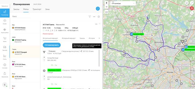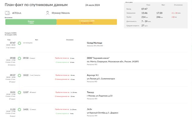 Теперь пользователи могут видеть на карте как плановые, так и фактические треки движения. На основании этих данных рассчитываются стоянки в точках маршрута, определяется фактическое начало и окончание рейса. Также рассчитывается фактический километраж и длительность рейса.