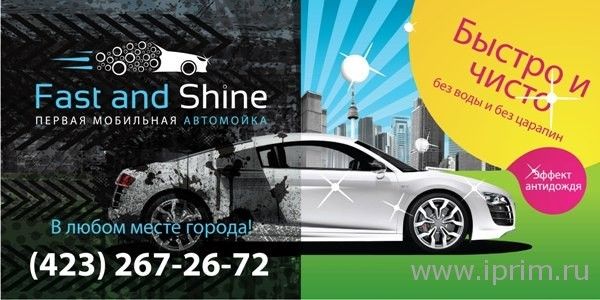 Отделение Fast&Shine во Владивостоке работает по франшизе: местный персонал компании проходит двухнедельную стажировку в Москве, а микрофибровые салфетки и патентованная химия поставляются в Приморский край оптовыми партиями. Собственно, для бизнеса больше ничего и не нужно. Клиент может, как приехать на стационарную мойку самостоятельно, так и вызвать мобильную бригаду мойщиков по телефону 2-672-672 в любое удобное для него место в пределах черты города. Единственное условие – наличие уличного освещения в непосредственной близости от автомобиля.