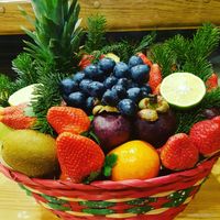 Первый вариант интересного и съедобного украшения для вашего праздничного стола - фруктовая корзина. Мы предлагаем вашему вниманию корзинки с фруктами, декорированные хвойными веточками, лентами, бусами шариками и снежинками. Все фрукты тщательно моются и обрабатываются кипятком. Полностью готовы к употреблению. Уложены на салфетку и не соприкасаются с корзинкой.
