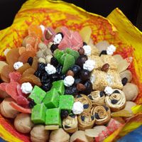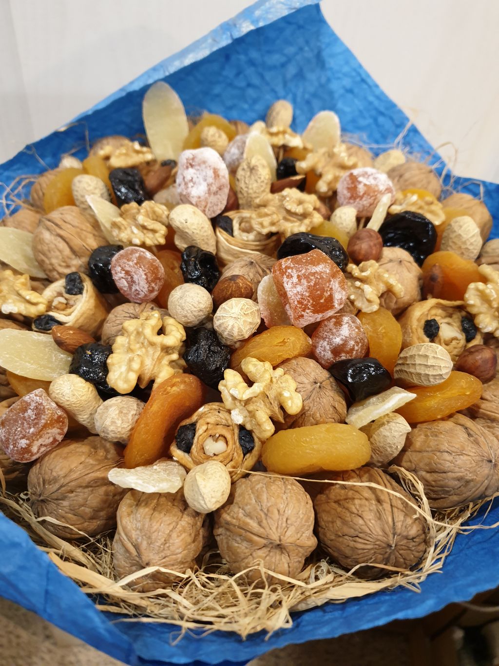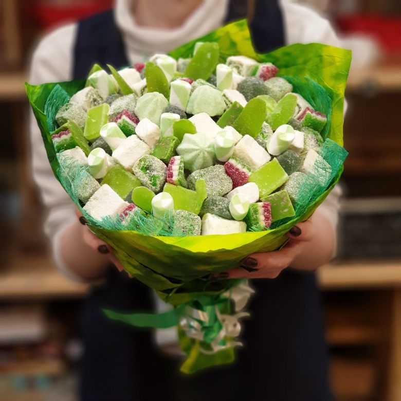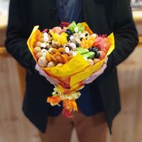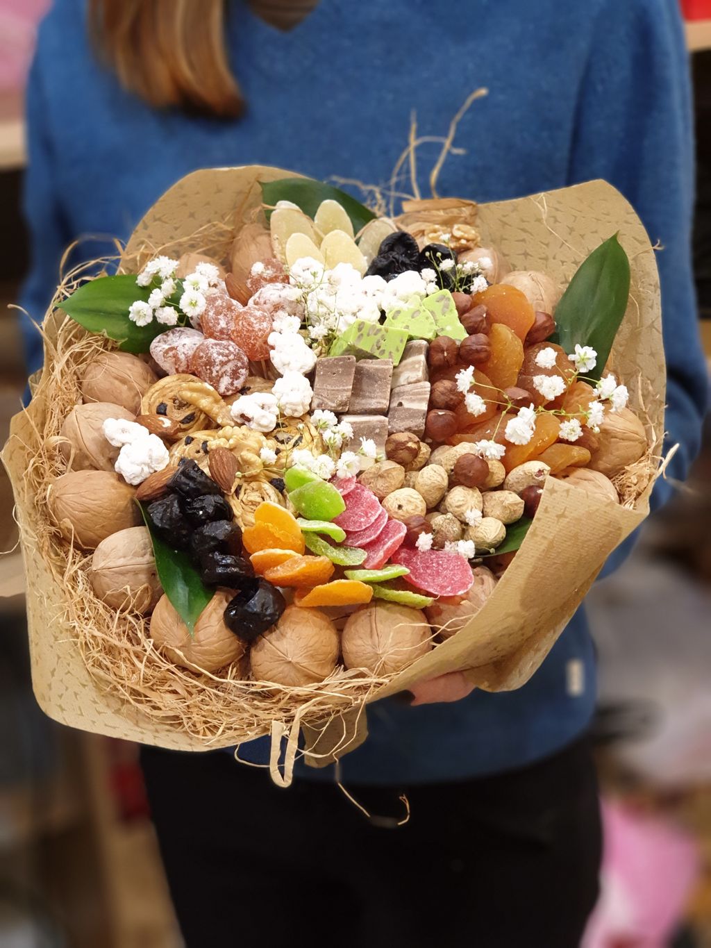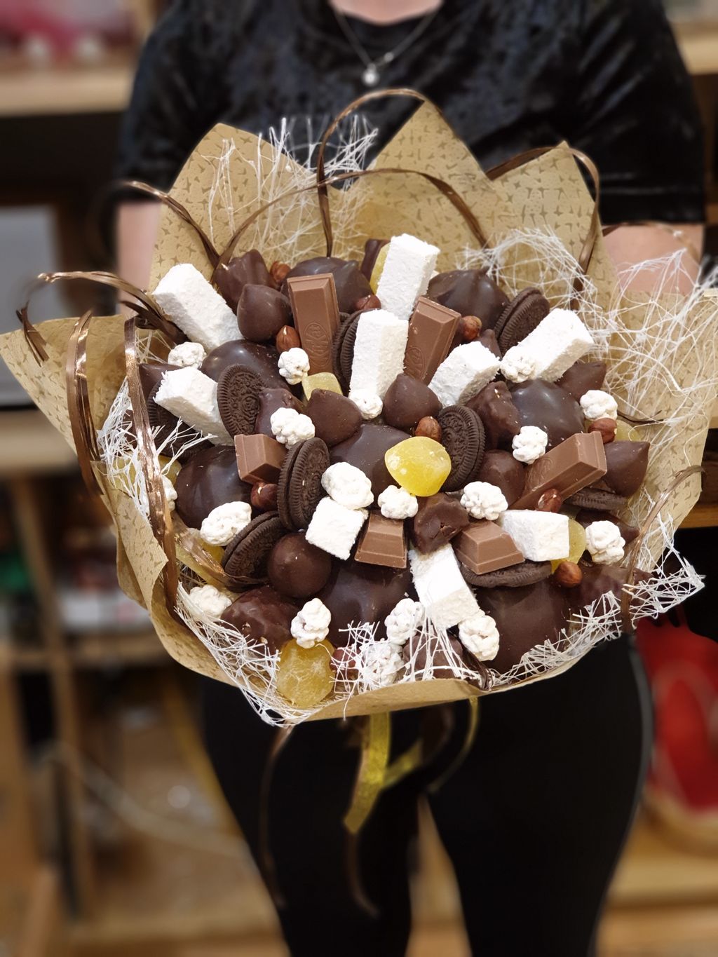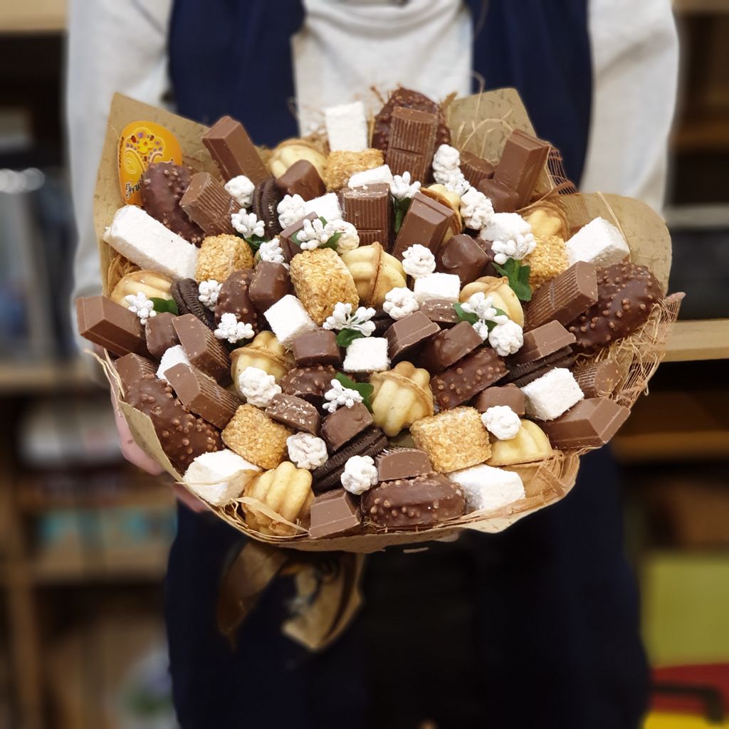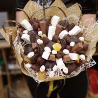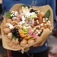 Букеты из шоколада, орехов, сухофруктов, халвы, зефира и мармелада.