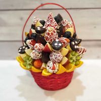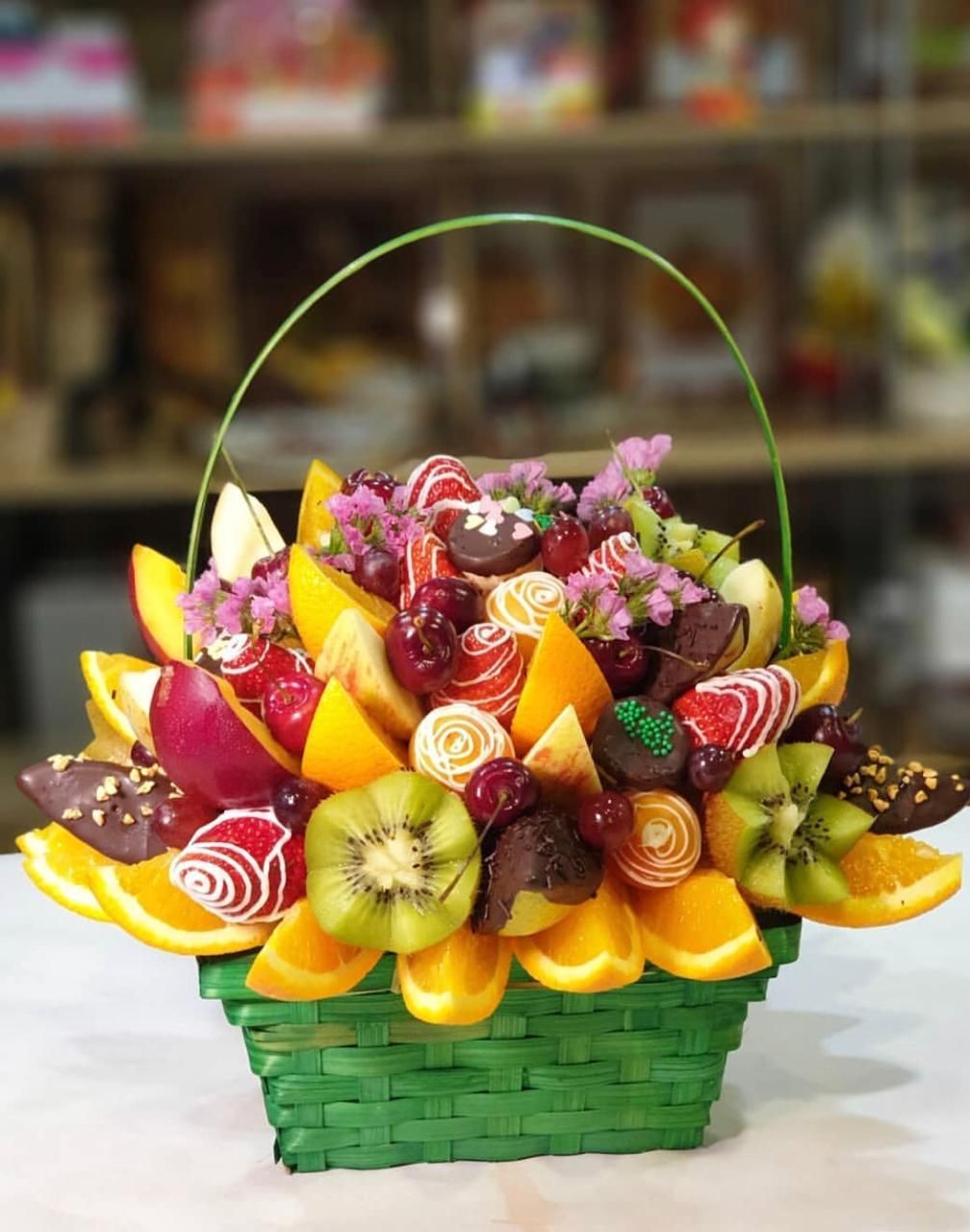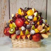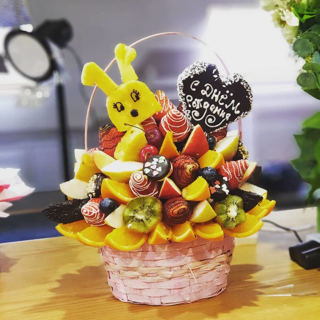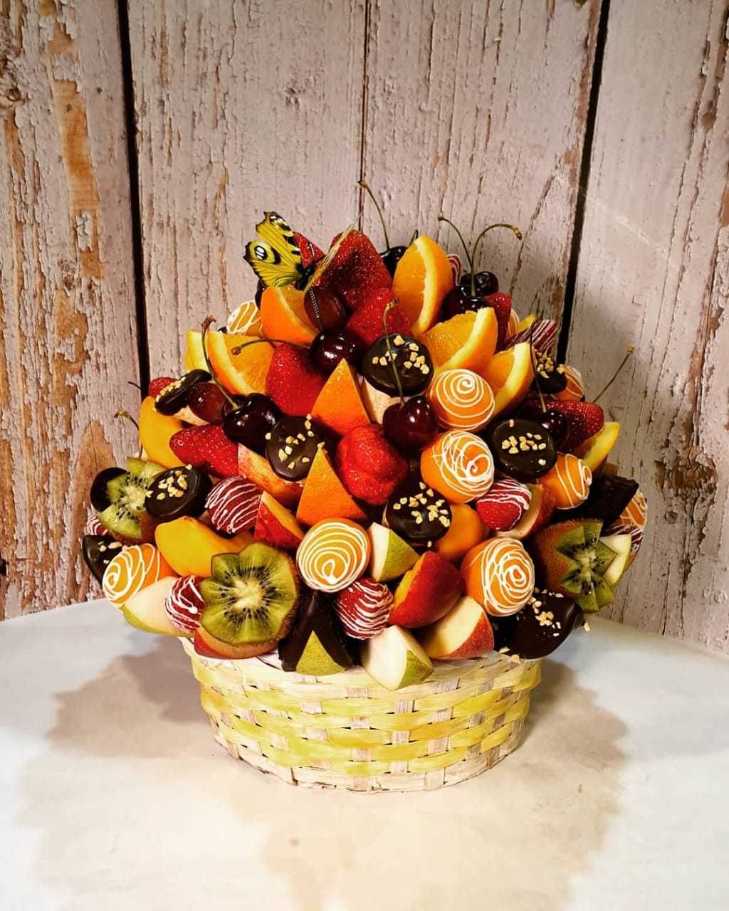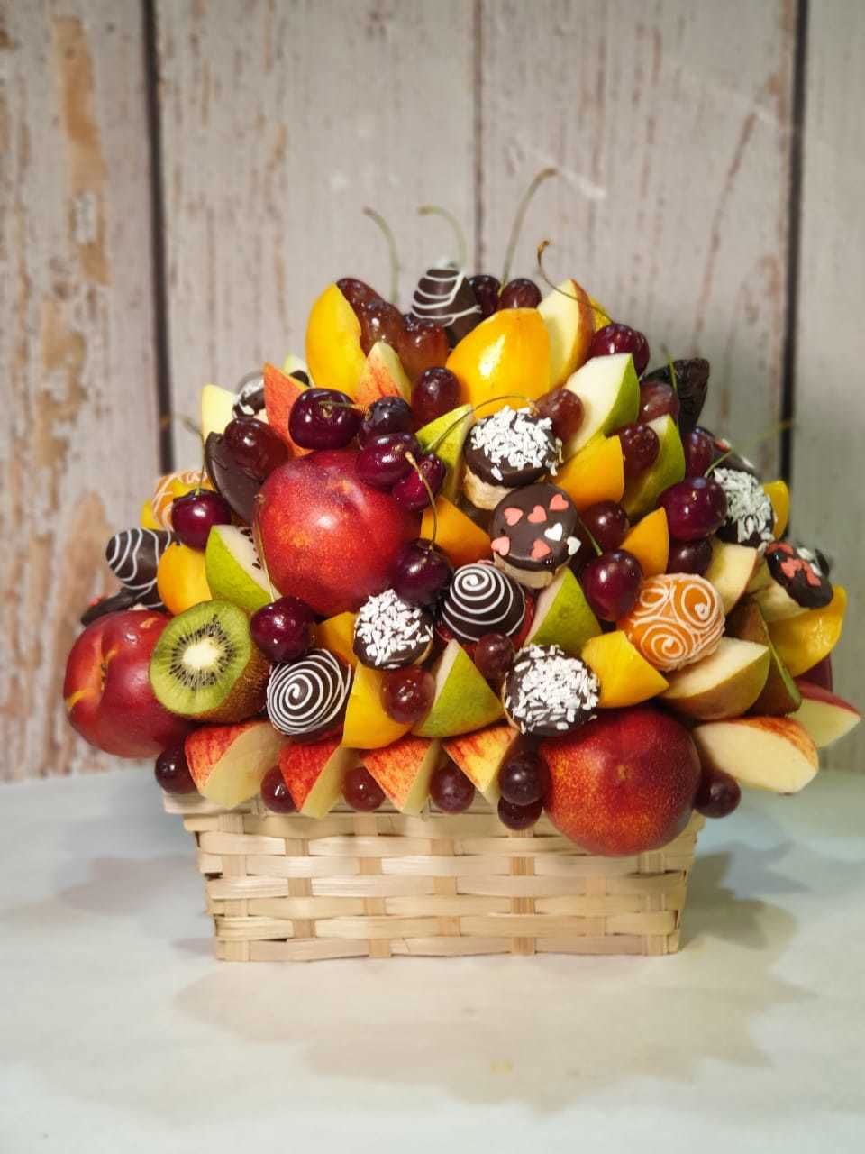 - Корзины с цельными фруктами разных размеров (фруктовые, комбинированные с цветами и сладостями)