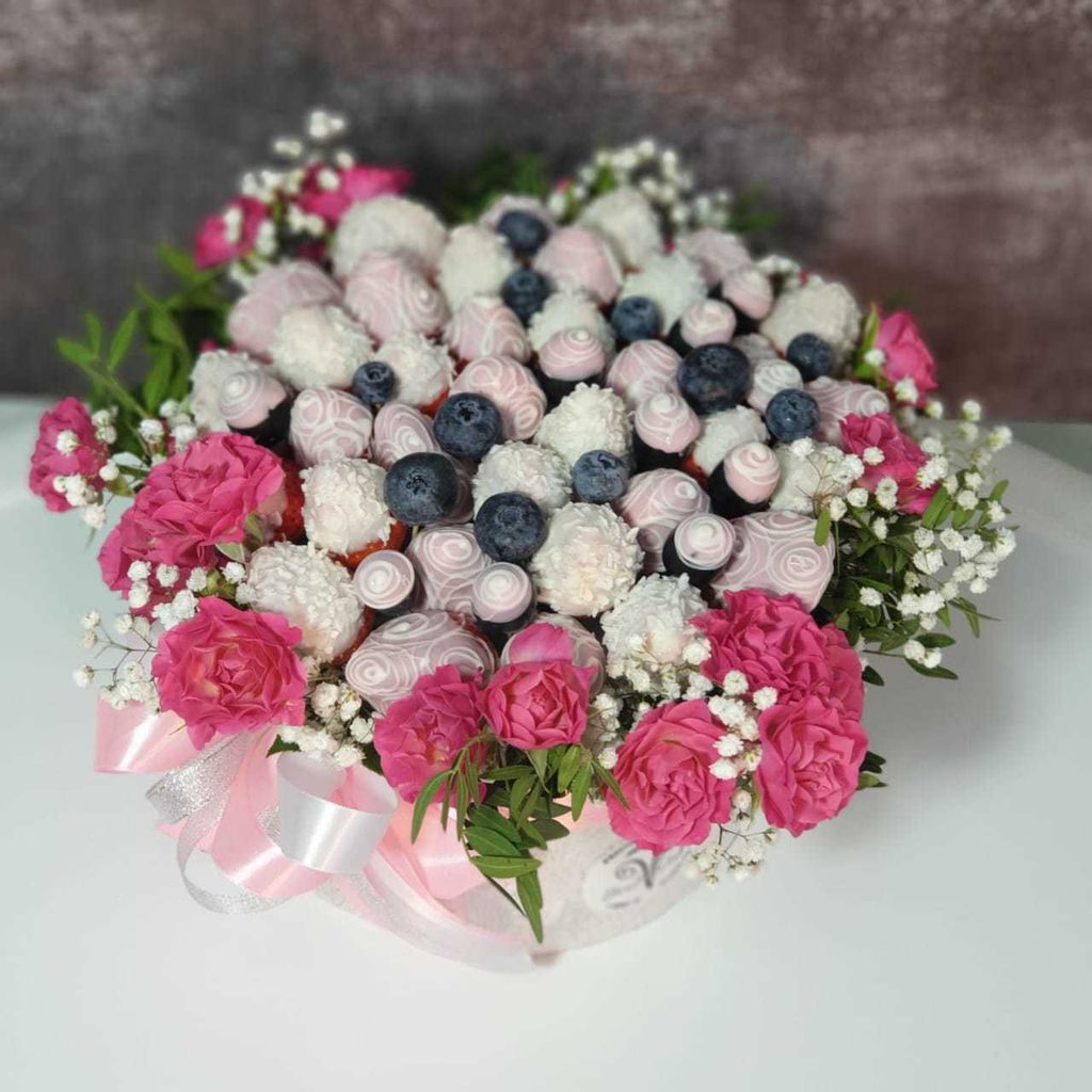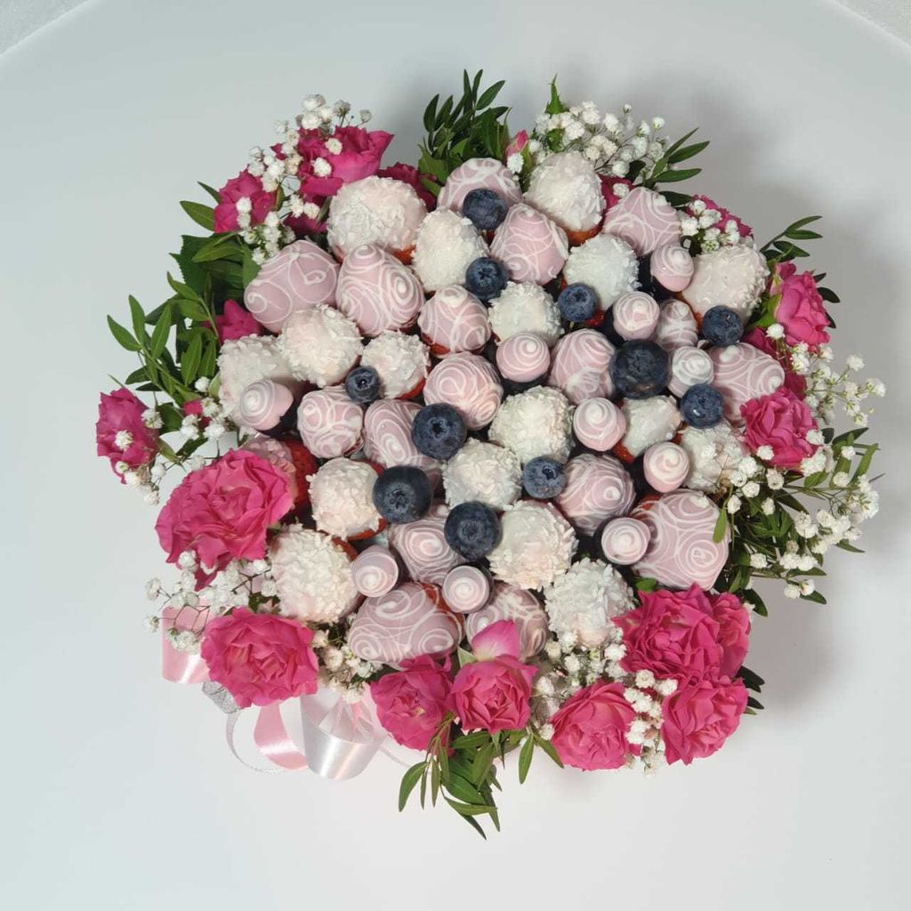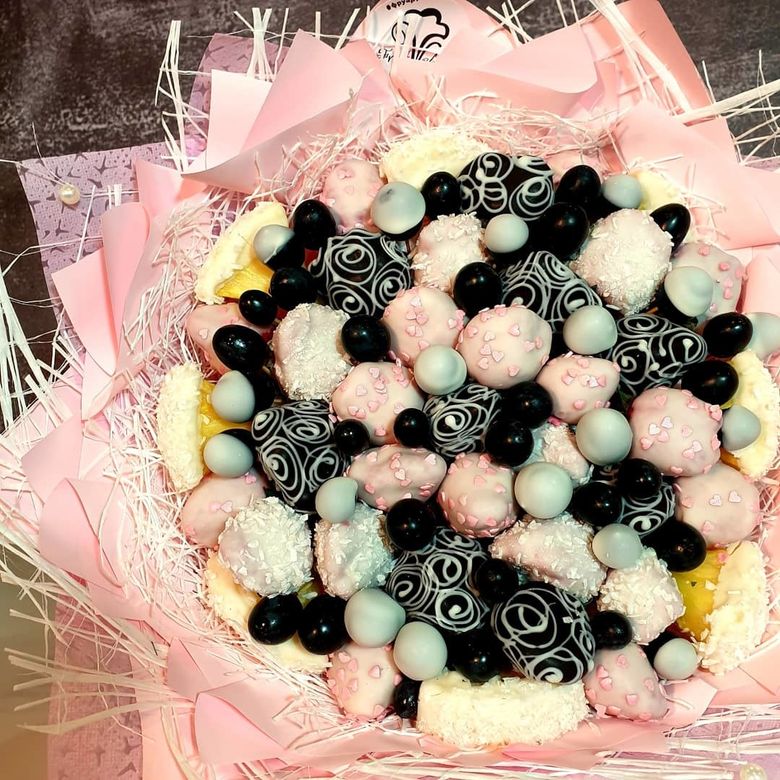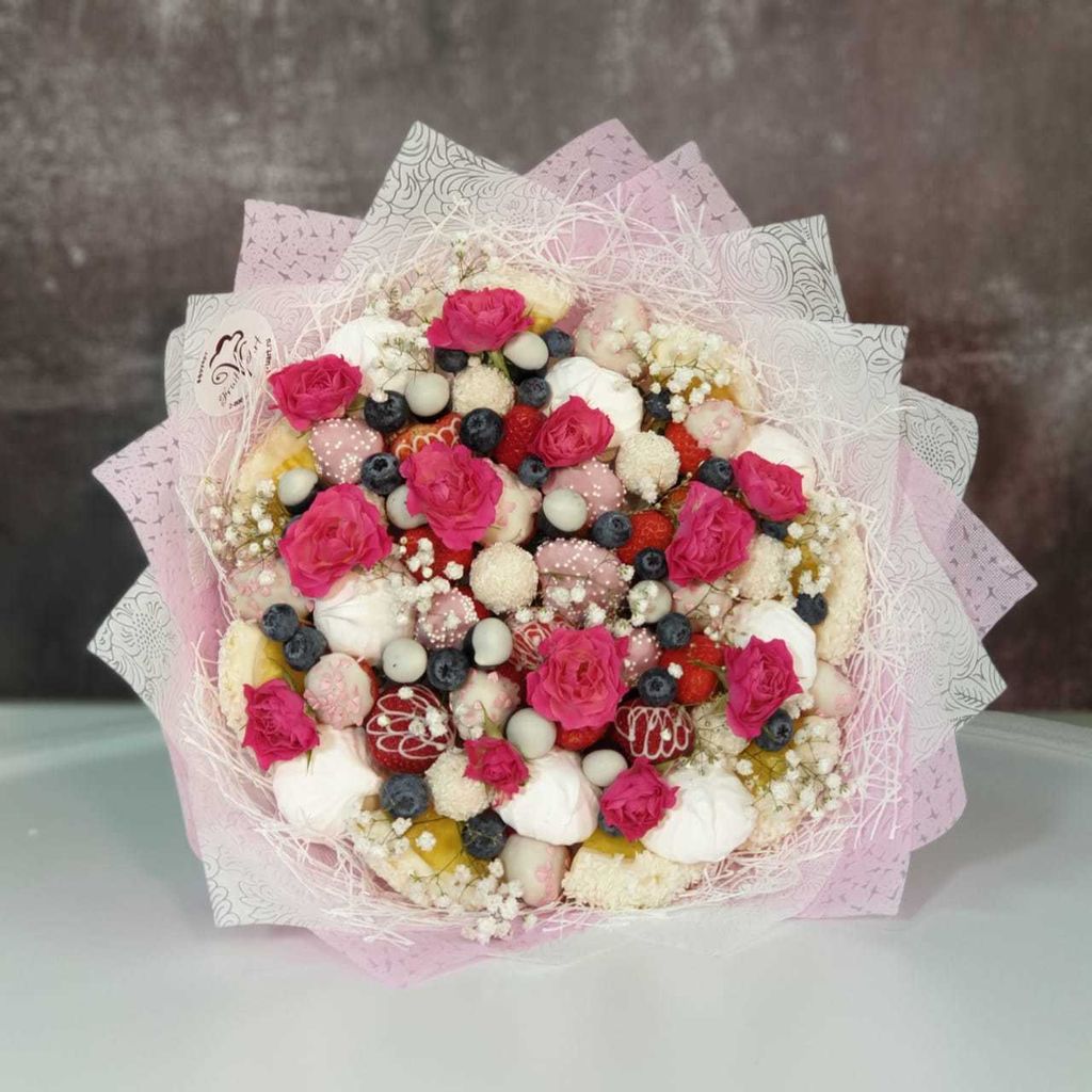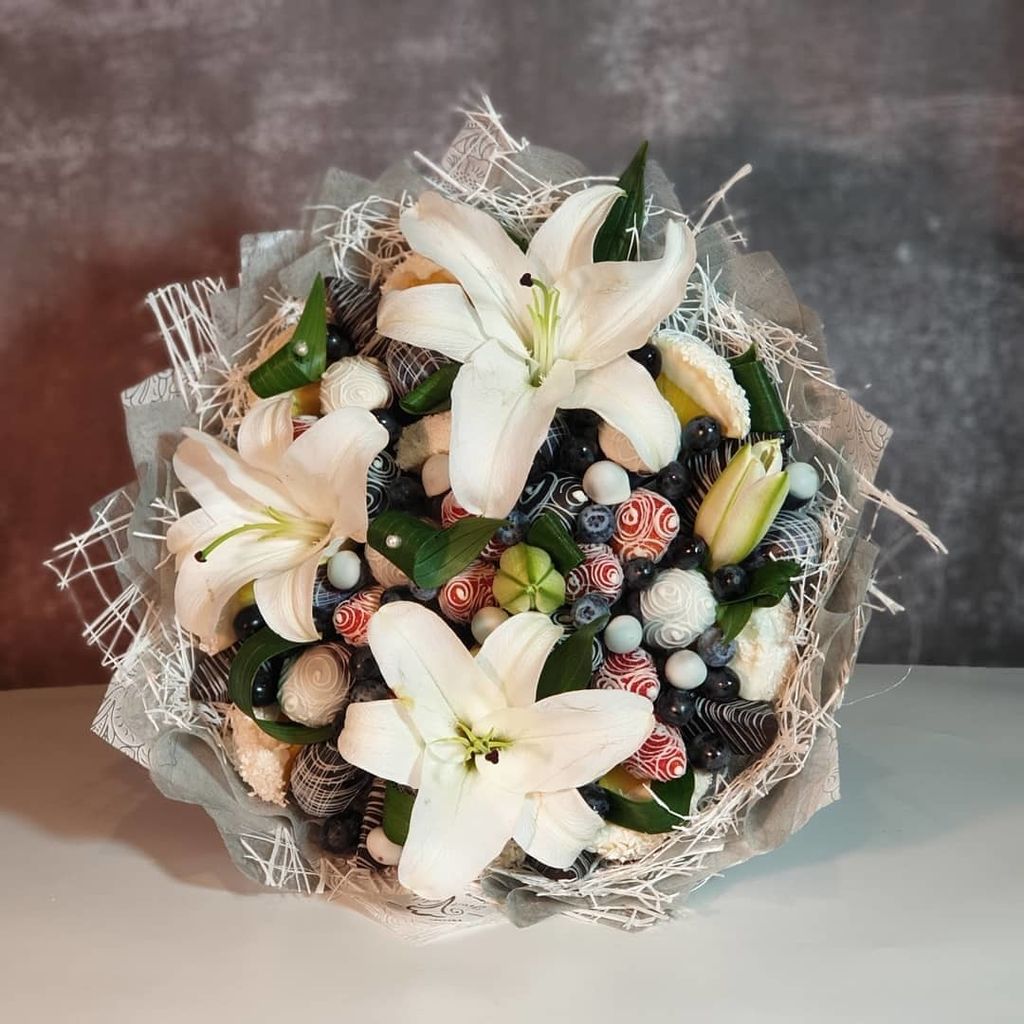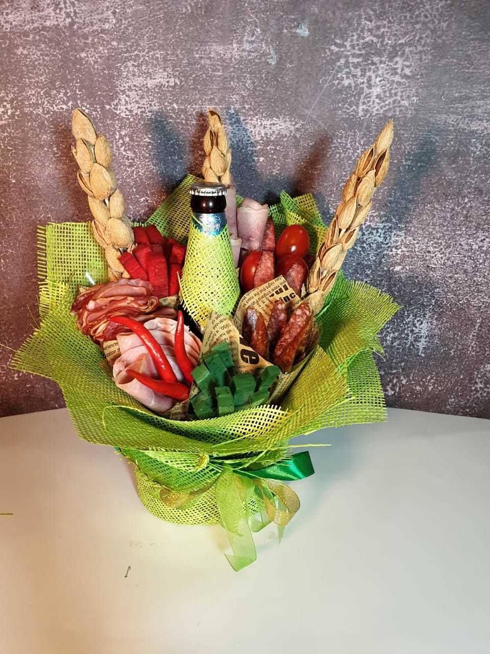 Наши флористы делают букеты и композиции из фруктов, овощей, орешков, сыров и копченостей. Маленьких сладкоежек можно порадовать конфетным букетом или композицией из клубники в шоколаде. Отцу, брату или лучшему другу наверняка придется по вкусу подарочный набор из хорошего алкоголя и закуски или мясная композиция. Представительницы прекрасного пола с удовольствием будут рассматривать, фотографировать и выставлять в инстаграм, хвастаясь подругам, букет из фруктов или ягод, дополненный живыми цветами.