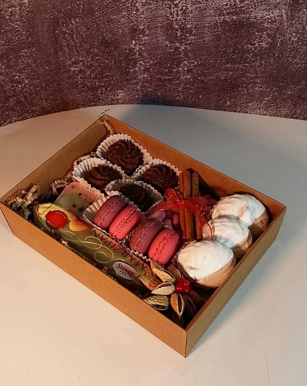 Мы можем изготовить для вас композицию или букет любой сложности и из любых продуктов! Хотите подарить крафтовую коробочку со сладостями или пирожными? И это нам под силу!