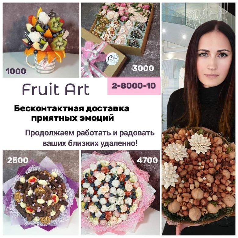 Наша студия работает ежедневно с 09:00 до 18:00. Круглосуточный прием заказов на сайте www.fruart.ru. Доставка ежедневно с 09:00 до 21:00. Есть бесконтактная доставка по Владивостоку. Стоимость - 300 рублей.