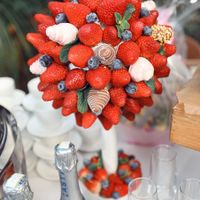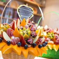 Тренд последних сезонов - фруктовые торты, а также собранные из самых разнообразных фруктов и ягод букеты, фигурки, композиции и пальмы. Еще один интересный вариант - фруктовое дерево. Такое интересное оформление придаст свежести любому застолью!