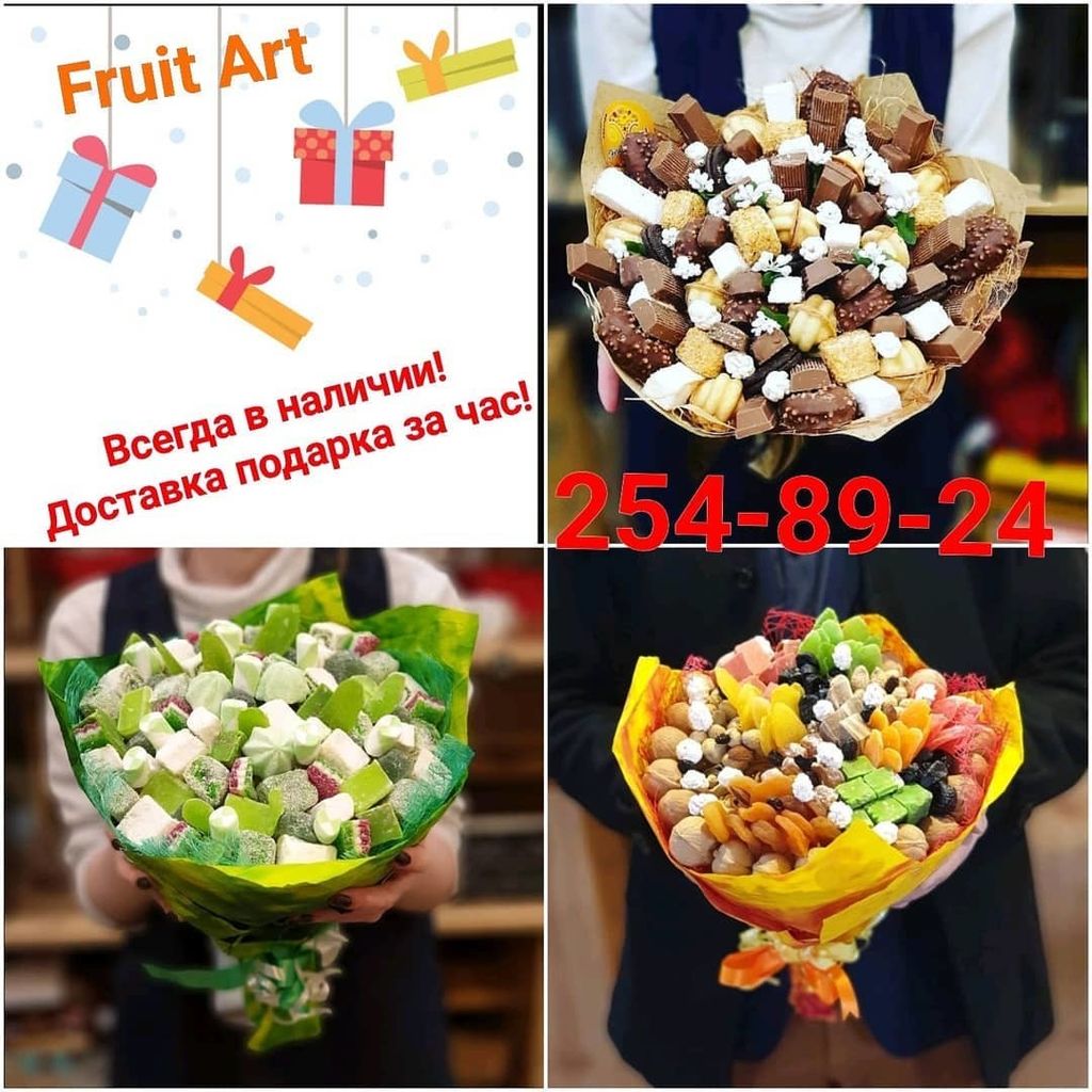 В студии фуд-флористики "Fruit Art" изготовят самый сладкий и самый вкусный букет, используя различные шоколадные элементы. И целого дня не хватит, чтобы попробовать каждый из них. При желании можно разнообразить сладкий подарок мармеладом, печеньем или орехами, добавить ягоды или фрукты в шоколаде, оформленные в виде пингвинчиков, единорогов, мишек и прочих зверушек.