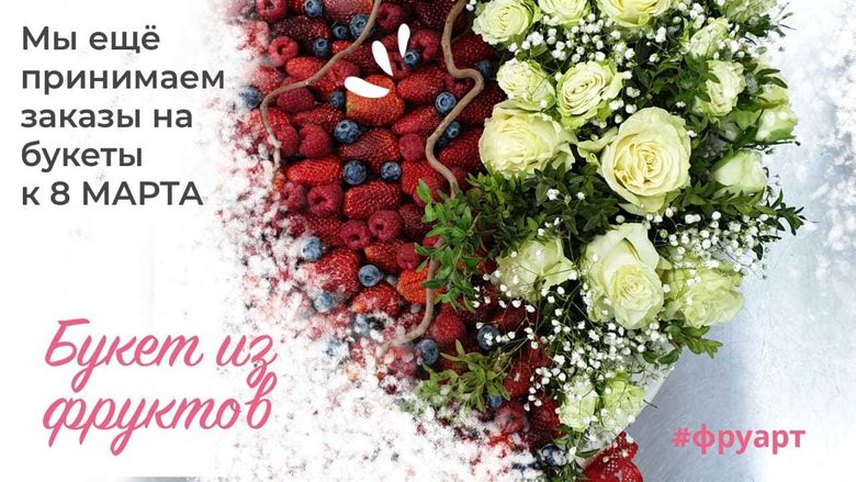 Компания "Fruit Art" продолжает принимать заказы на букеты, корзинки, коробочки и прочие вкусные подарки для коллег, жен, подруг, мам, бабушек и дочерей. Смотрите фото, вдохновляйтесь и создавайте свои великолепно-пышные или изящно-лаконичные подарки на восьмое марта. Мы подберем самые свежие фрукты, самые красивые цветы и самые вкусные сладости.