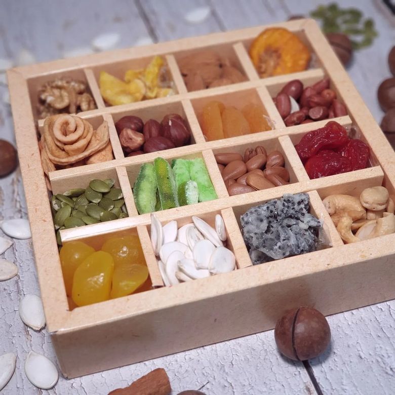 Кроме букетов можем предложить вкусные наборы с орешками и сухофруктами на 9 или 16 ячеек. Стоимость такого подарка: