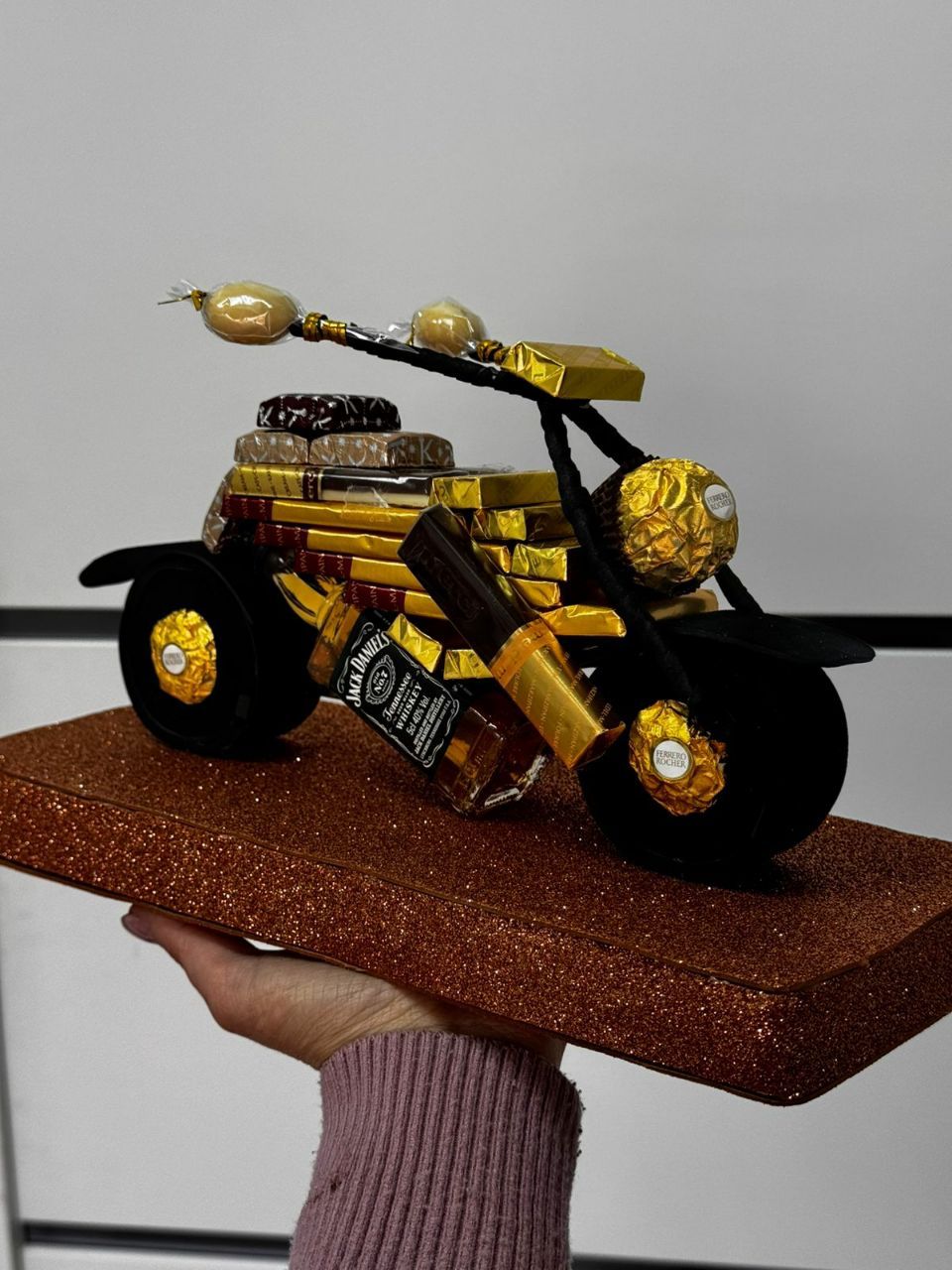 - Крепится на ножку — удобно нести и вручать.