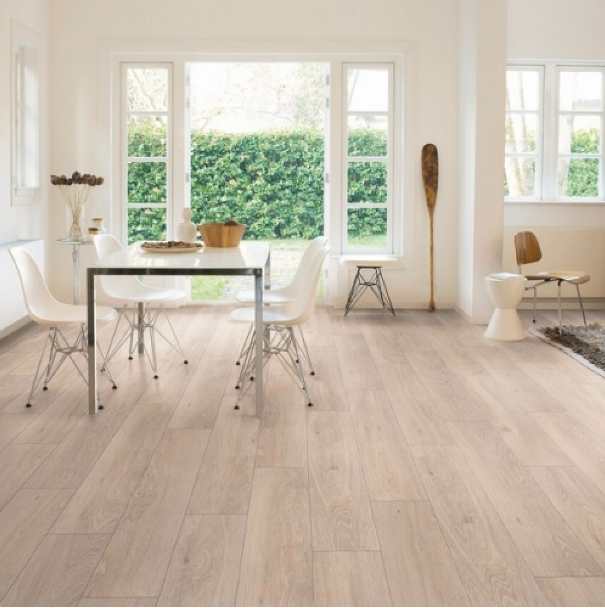 Поверх рисунка наносится слой меламиновой смолы, который и придает прочность покрытию. Толщина верхнего защитного слоя определяет класс ламината 31, 32, 33. Очень важный показатель - плотность плиты. Чем выше плотность, тем менее подвержен ламинат изменениям в размерах, а значит на стыках не появятся щели. От плотности ламината зависит и его влагостойскость. Внешний вид ламината определяет рисунок нанесенный на HDF плиту, наличие или отсутствие фаски и тиснение. Фаска это V образная канавка с 4-ех сторон, или по 2-ум длинным сторонам ламината. Бывает пиленая, продавленная, крашеная, ламинированная. Бывает глубокая или микрофаска. Фаска никак не влияет на технические характеристики ламината, на его эксплуатационные свойства, это исключительно эстетическая составляющая.