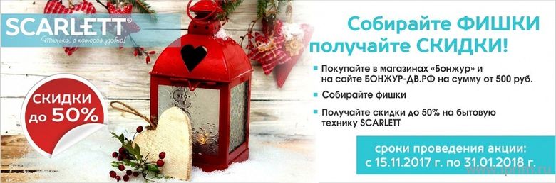 Набрав нужное количество фишек, вы можете выбрать товар SCARLETT, находящийся на акционном стенде в торговом зале магазинов «Бонжур» и «Центр распродаж» или на сайте Бонжур-ДВ.рф.