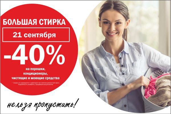 Для заботливых хозяек мы объявляем день Большой стирки в нашем интернет-магазине. Скидка 40% только один день, 21 сентября, на весь ассортимент стиральных порошков, кондиционеров и не только! Сделайте заказ на сайте со скидкой 40% в субботу 21 сентября и выберите доставку на любой удобный вам день!