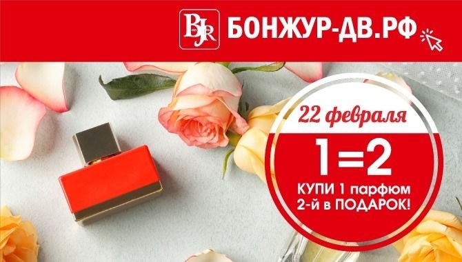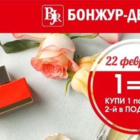 Только один день 22 февраля, при покупке двух ароматов в сети магазинов БОНЖУР, второй по наименьшей стоимости вы получаете в подарок!