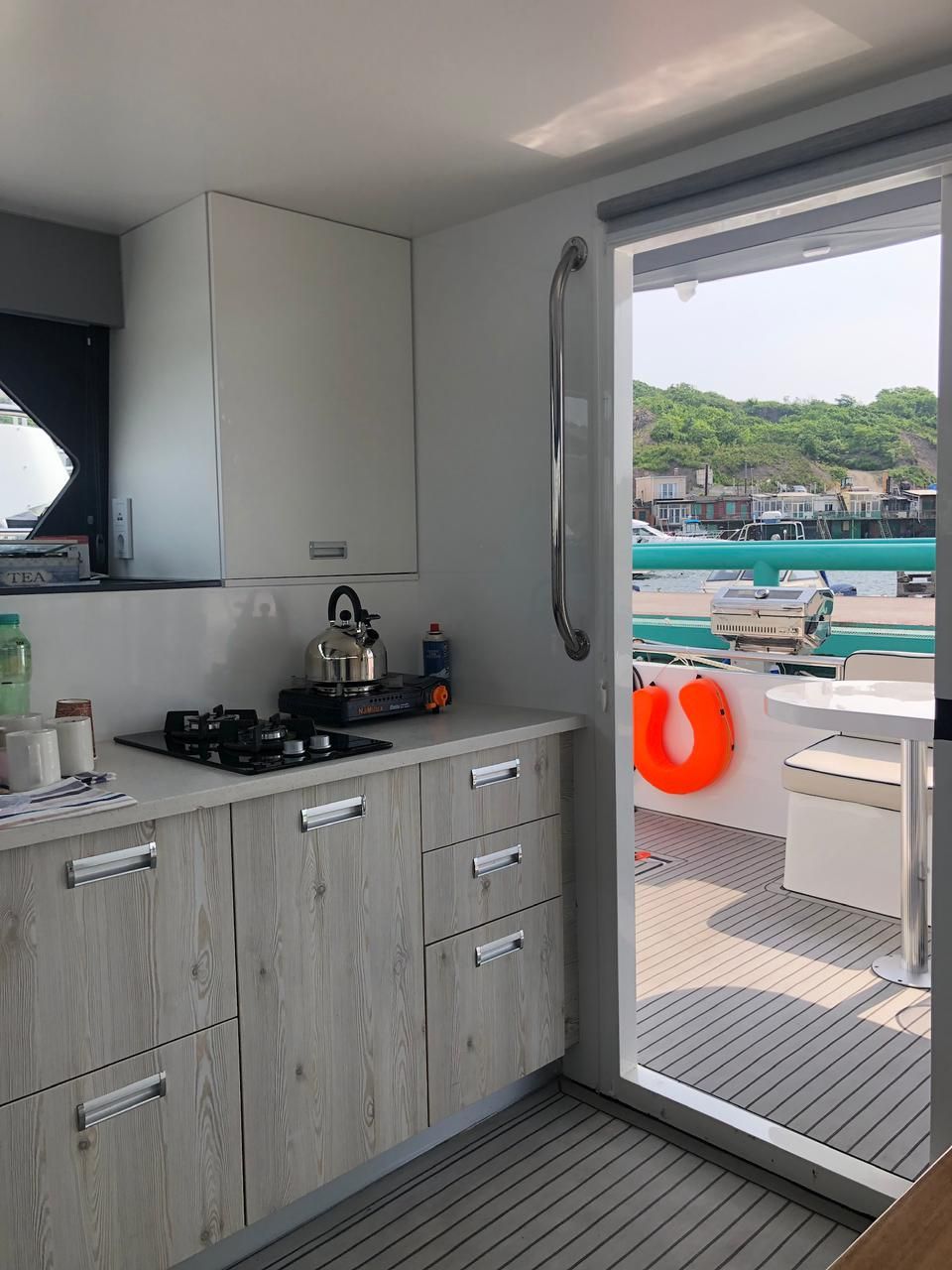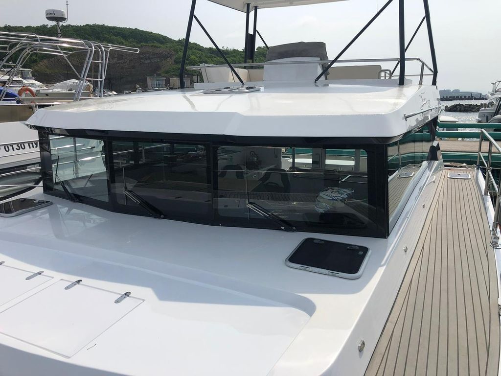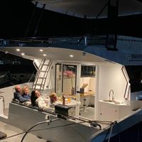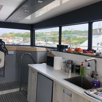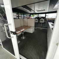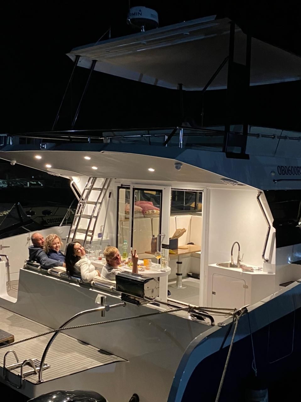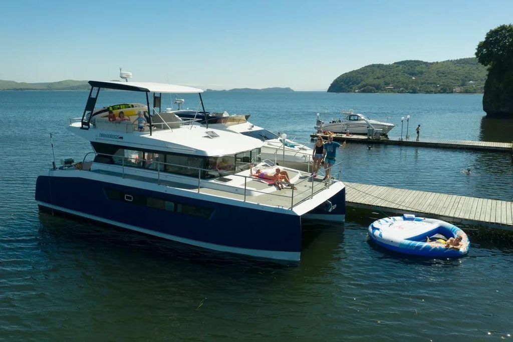 Катамаран оснащён всеми средствами безопасности: ПСН 2шт, спасжилеты, лодка с мотором.