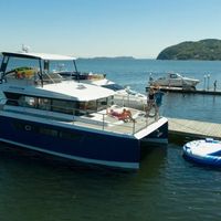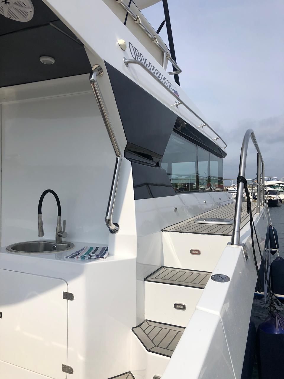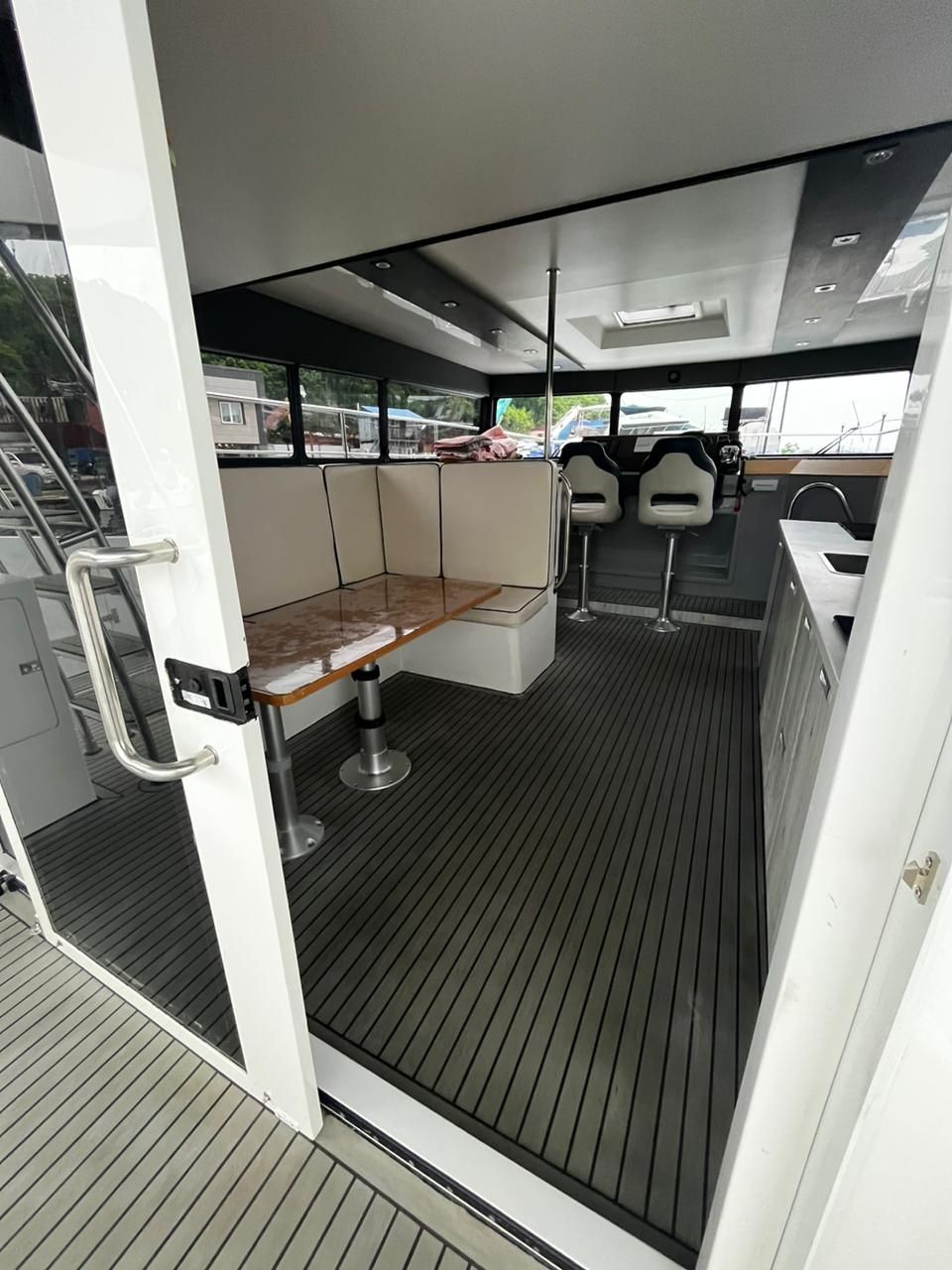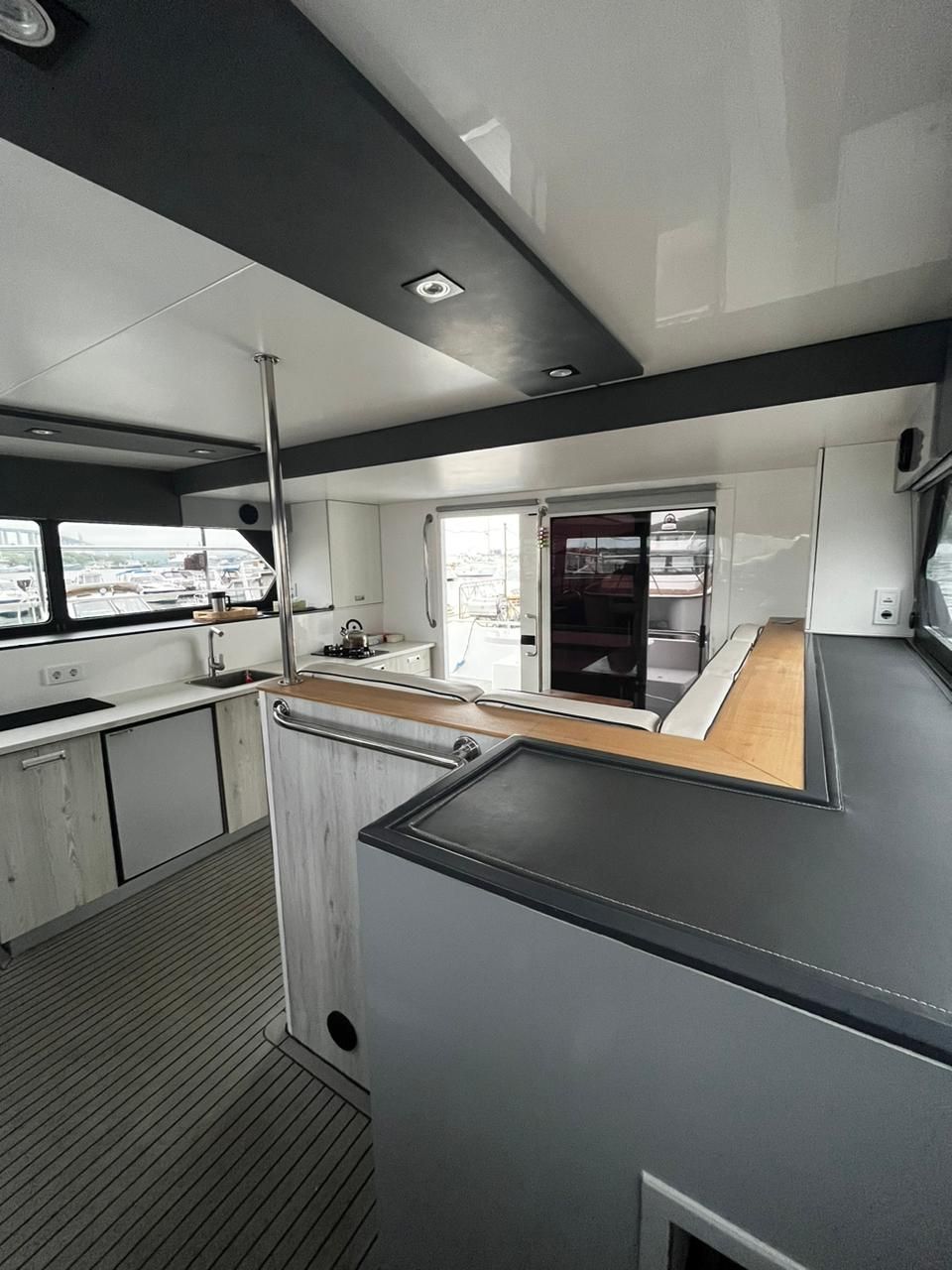 Катамаран оснащён всеми средствами безопасности: ПСН 2шт, спасжилеты, лодка с мотором.