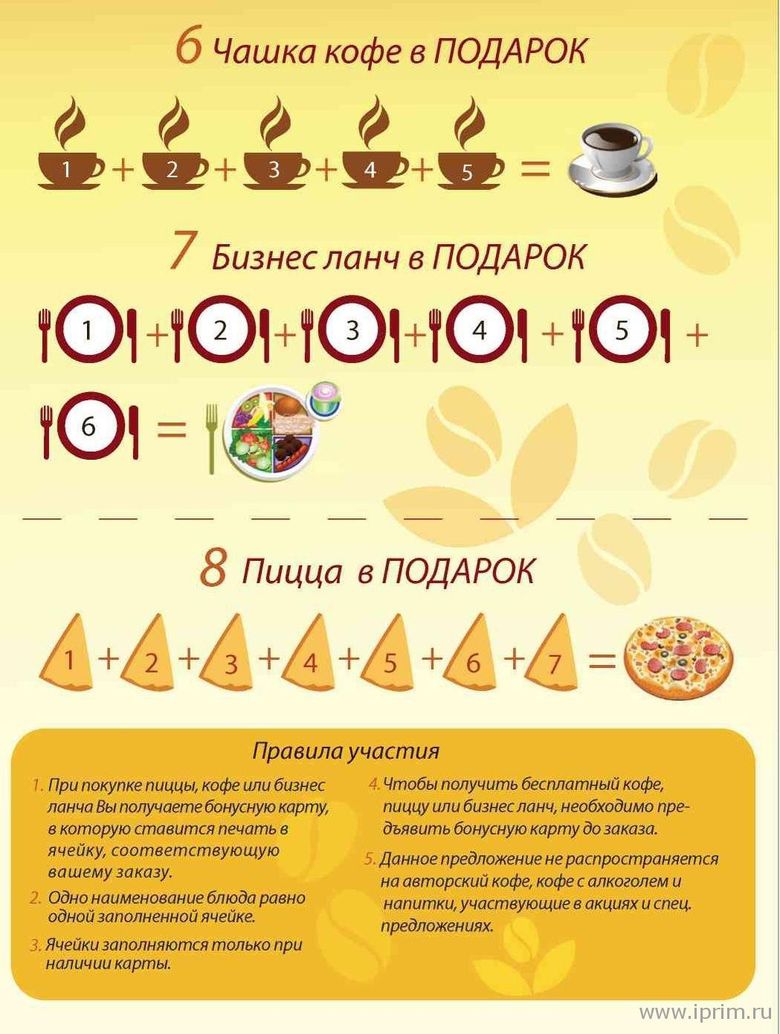 При наличии бонусной карты Вы можете получить бесплатно каждую пятую кружку кофе, каждый седьмой бизнес-ланч и каждую восьмую пиццу!