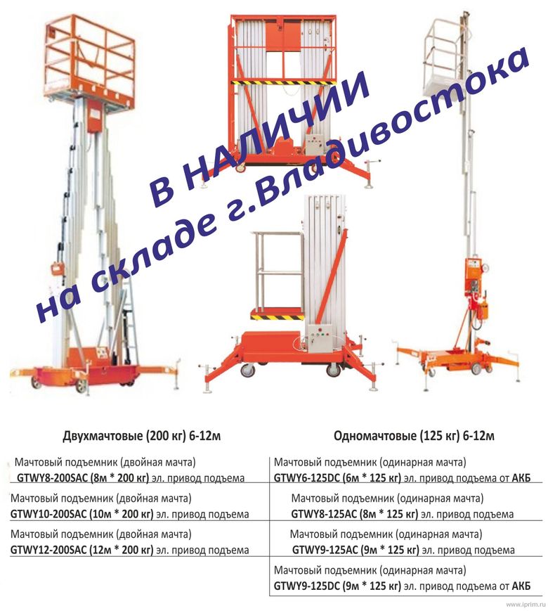 Так же в наличии двухсекционные мачтовые подъемники. Высота подъема у них составляет 8 м / 10 м / 12 метров. А вот грузоподъемность уже 200 кг!