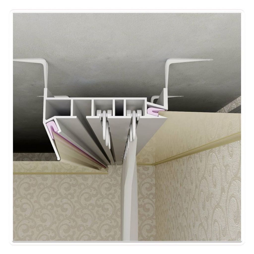 Опытные потолочники знают если не все, то минимум около десятка вариантов. Сегодня мы расскажем о профиле для натяжного потолка, который в себе совмещает монтажный профиль для натяжного полотна и карниз для штор. Он называется профиль ПК5. Есть еще ПК15. Отличается количеством рядов.