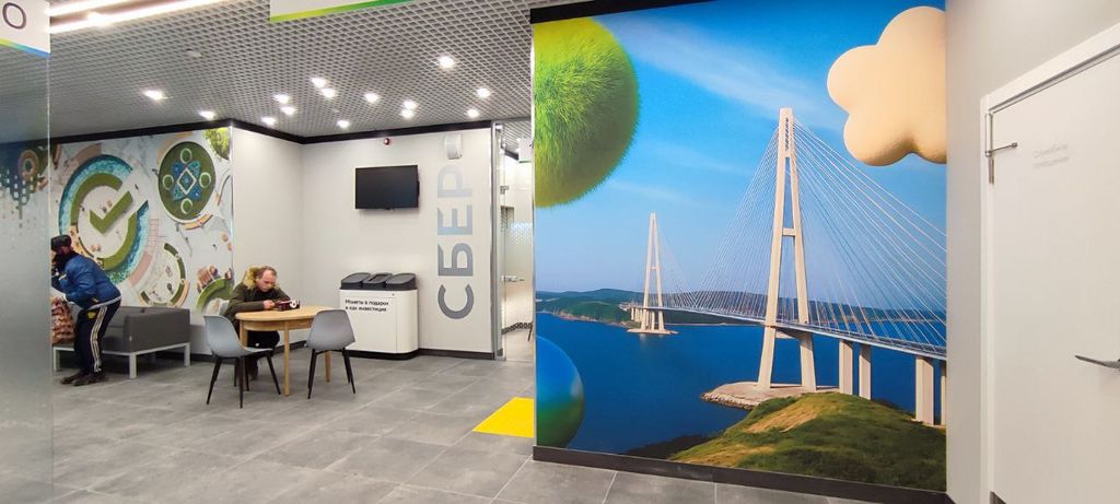 Недавно специалисты мастерской рекламы и дизайна "Аксиома" завершили брендирование еще одного офиса Сбербанка по адресу ул. Луговая 18. Особое внимание предлагаем обратить на триптихи с подствекой и паттерны на стеклянных перегородках, придающие пространству офиса изящную детализированность и уют.