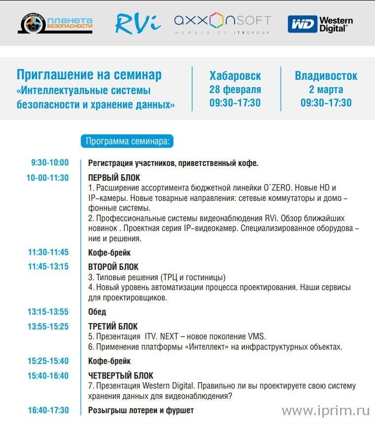 Торговый Дом Планета Безопасности - ведущий поставщик систем видеонаблюдения на ДВ, совместно с RVi Group - российским разработчиком и производителем систем безопасности, ITV | AxxonSoft - ведущим российским разработчиком ПО для систем безопасности и Компанией WD - мировым лидером в производстве цифровых накопителей, приглашает вас посетить бесплатный семинар на тему "Интеллектуальные системы безопасности и хранение данных".