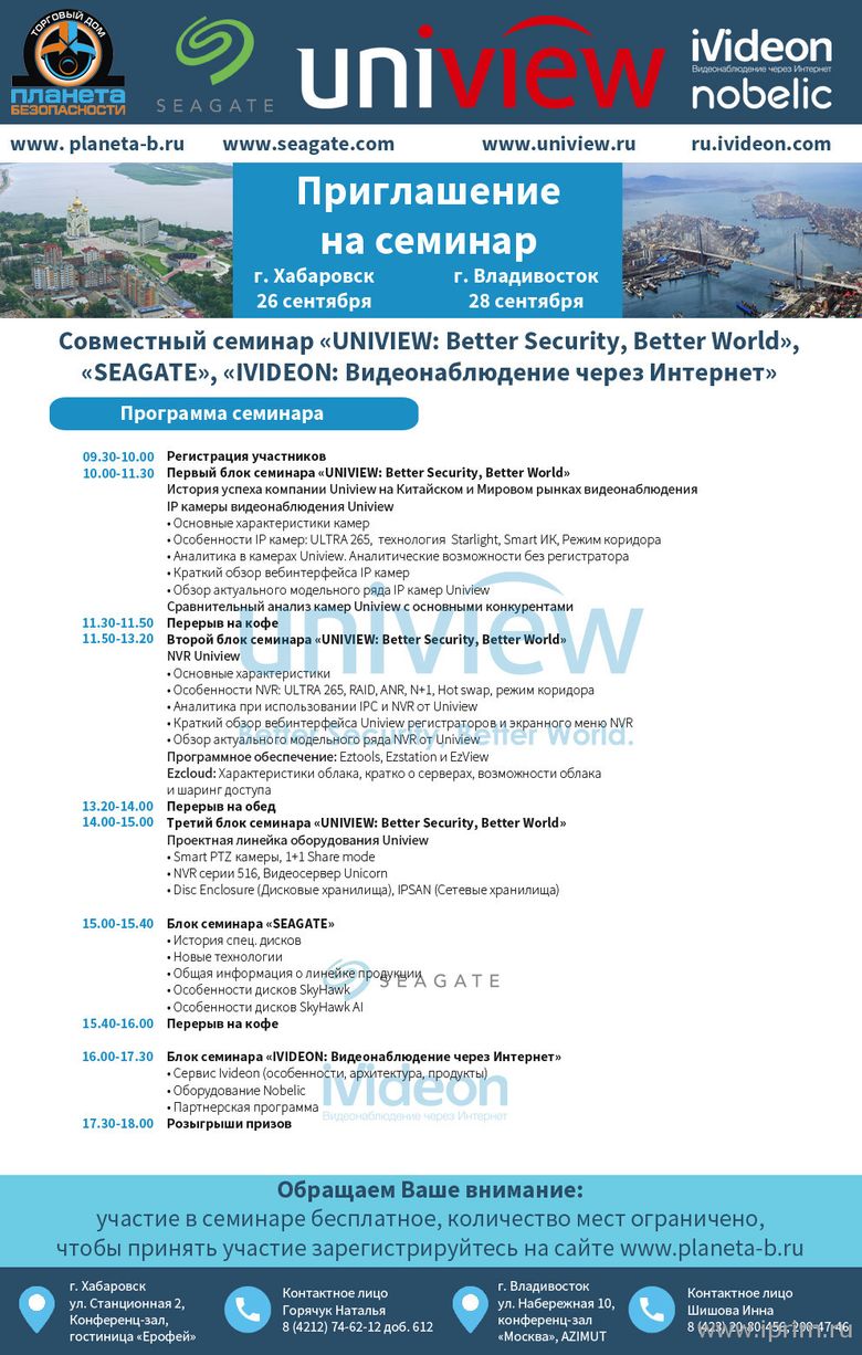 Торговый Дом "Планета Безопасности" совместно c компанией «UNIVIEW» (одним из мировых лидеров в сфере видеонаблюдения), компанией "SEAGATE" (производителем специализированных жестких дисков для систем видеонаблюдения), а так же компанией "IVIDEON" (российским лидером облачного сервиса для видеонаблюдения) приглашает Вас принять участие в бесплатных образовательных семинарах.