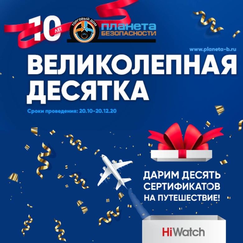 Приглашаем Вас принять участие в очередной совместной акции с брендом HiWatch, посвящённой 10-летию нашей компании и получить возможность выиграть один из десяти сертификатов на увлекательное путешествие!
