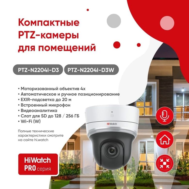HiWatch выпустил новые компактные поворотные IP-камеры PRO-серии PTZ-N2204I-D3 и PTZ-N2204I-D3/W для установки внутри помещений. Эргономичный дизайн и миниатюрный размер корпуса (125 х 137.2 мм) позволяют использовать PTZ-камеры для мониторинга безопасности в ограниченных пространствах или в местах, где необходимы компактные решения.