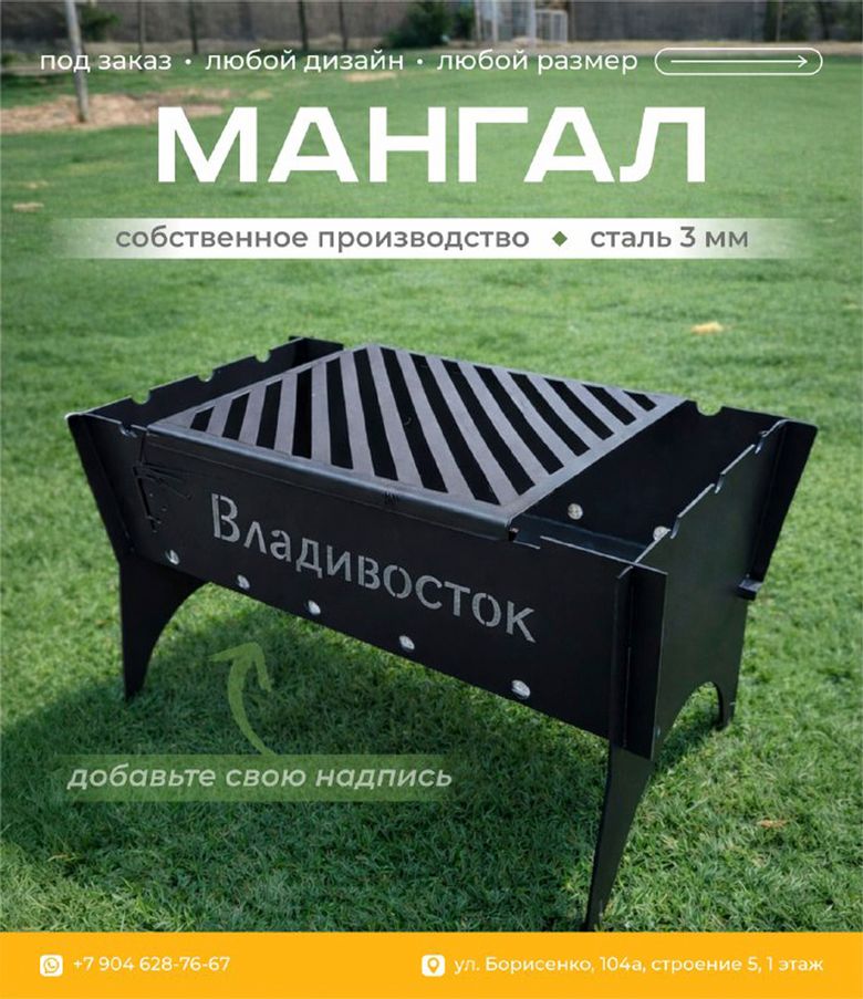Чтобы узнать стоимость изготовления мангала и любой другой металлоконструкции, пишите нам в WhatsApp. С радостью проконсультируем вас по телефону, для этого звоните по номеру +7 423 298-76-67, +7 423 298-26-62 или +7 904 628-76-67. Консультация - бесплатно.