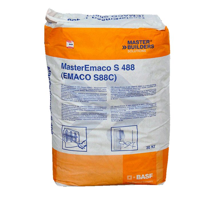 MasterEmaco S 488 PG — готовый к применению материал в виде сухой растворной смеси. Содержит полимерную фибру, предназначен для конструкционного ремонта бетона и железобетона. Максимальная крупность заполнителя в MasterEmaco S 488 PG составляет 2,5 мм. При смешивании с водой образуется реопластичный, литой, не расслаивающийся раствор. Материал рекомендуется применять для проведения ремонтных работ методом заливки на толщину от 20 до 40 мм. MasterEmaco S 488 PG не содержит металлических заполнителей и хлоридов.
