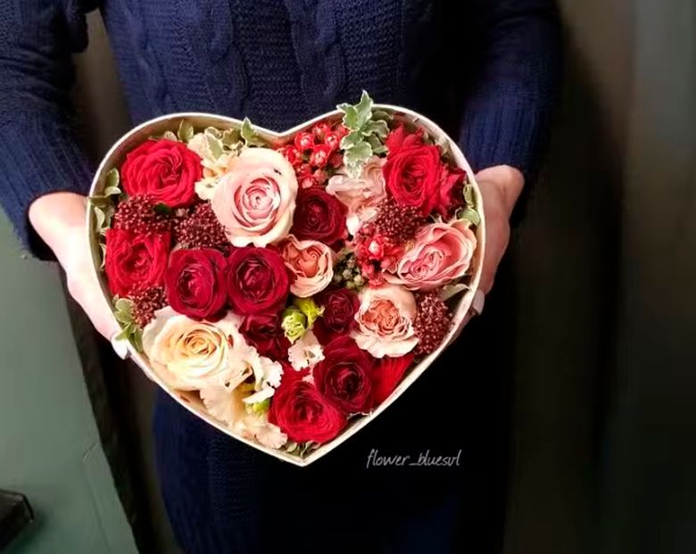 На День святого Валентина также популярны цветочные композиции и боксы в форме сердца. Основой бокса является оазис, который увлажняет цветы, упрощая уход за подарком.