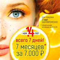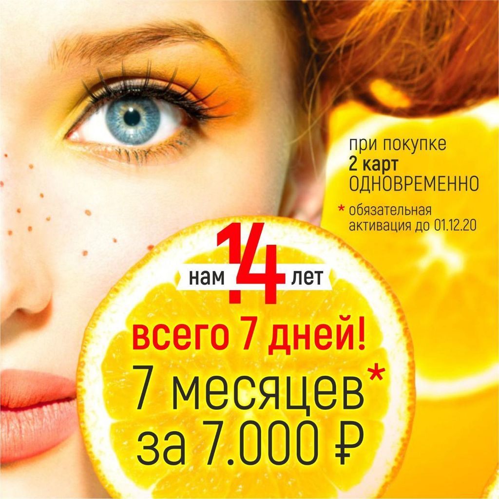 В честь дня рождения фитнес-клубов "ОранжЛайф" объявляет акцию: 7 месяцев фитнеса за 7000 рублей! Акция действует 7 дней при покупке двух клубных карт. Обязательна активация абонемента до 1 декабря 2020 года.