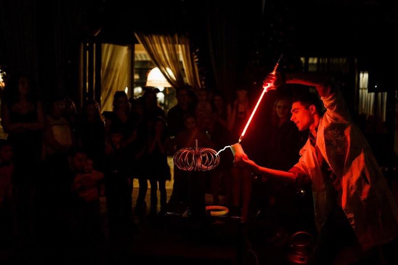 Номер проходит в затемненном помещении. Перед гостями предстанет человек, случайным образом оказавшейся в незнакомом месте с магическим столом. Герою становится интересно: что же там находится и как все это «работает». Эксперименты увлекают его вместе со зрителем, заставляя то пугаться, то удивляться, то восхищаться и смеяться… И тут в его руки попадает необычная палочка, которая сильно бьет его током… Дым, мерцание света, на столе включается «страшная» установка, и наш неумеха открывает в себе невероятные способности заклинателя молний, становясь повелителем электрического тока, коим был великий ученный Никола Тесла...