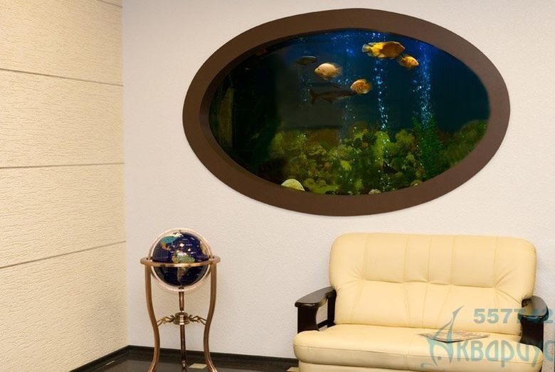 Вариантов формы аквариумов масса: квадратные, круглые, да хоть овальные. Их можно встроить в стену - оформить как своеобразную "живую картину", сделать частью перегородки между комнатами, разместить под прозрачным столом или же просто поставить компактный вариант на полочку или на стол.