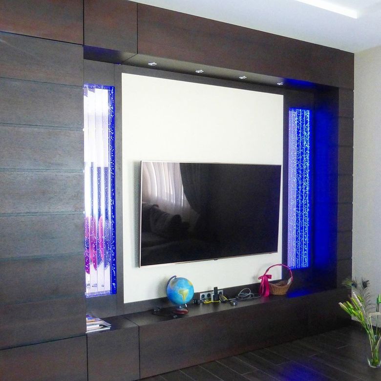 Сама по себе пузырьковая колонна представляет собой цилиндр, который изготавливается из оргстекла, а затем заполняется дистиллированной водой. Пузырьки выходят из форсунок и приобретают цвета подсветки. Подсветку вы можете выбирать по своему желанию. Цилиндр устанавливается на платформу, облицовку которой можно сделать из самых различных материалов - декоративного пластика, цветного стекла, натурального камня, плитки. Все зависит от вашей фантазии и пожеланий.